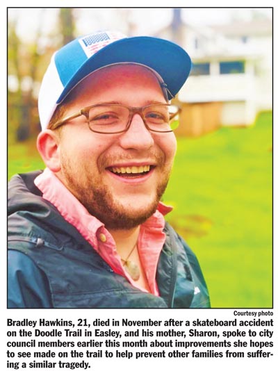 “Our 21-year-old son, Bradley Hawkins, was killed in a skateboard accident on the Doodle Trail near the corner of Wilburn and North Fourth streets on Nov. 10, 2021,” she said.