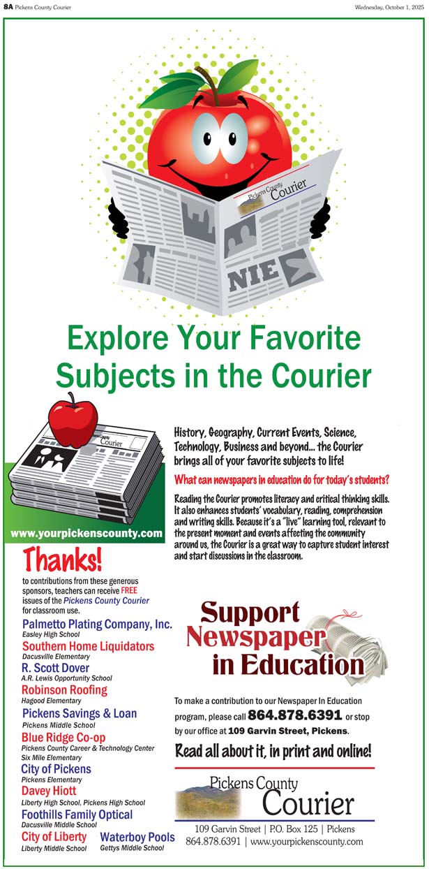 Sponsorships are just $250 and help ensure that every school in Pickens County receives 40 weekly copies of the Pickens County Courier.