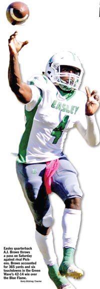 Pickens’ struggles began on the ensuing Easley possession, with the Green Wave taking over at their own 42 and quickly moving down the field on a 51-yard pass from Brown to Ethan Alexander. One play later, Brown hit receiver Chris Clemons on a nine-yard touchdown to take a 7-0 lead just three minutes into the game.