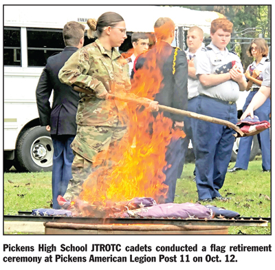 PICKENS — On Tuesday, Oct. 12, cadets of the Pickens High School JROTC conducted a flag retirement ceremony