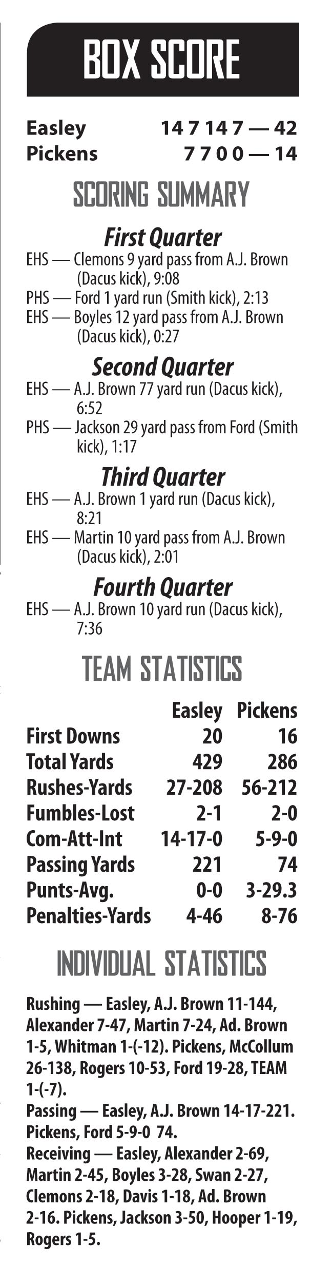 outscored 21-0 in the second half by rival Easley in a 42-14 loss.