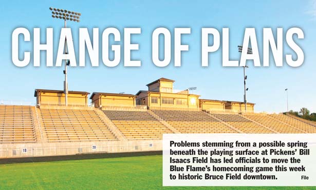 PICKENS — Potentially costly water issues at Pickens High School’s Bill Isaacs Field at Blue Flame Stadium have forced the Blue Flame’s homecoming game this Friday against Hendersonville (N.C.) to be moved to the historic