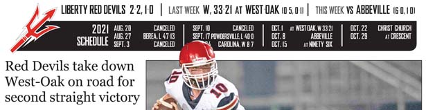 WESTMINSTER — Following a hard-fought 8-7 win over Carolina on Sept. 24, the Liberty Red Devils went into this week looking to continue their momentum with another win as region play began.