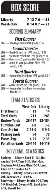 The first two plays of the game were indicative of what was to come, as flags flew with penalties on both West-Oak and Liberty. Overall, Liberty racked up 14 penalties for a total of 119 yards. In a typical game, that would be more than