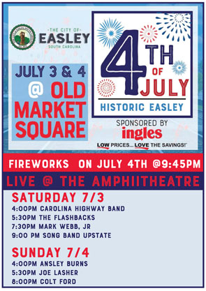 Beginning at 4 p.m. this Saturday, July 3, the square’s amphitheater will host concerts from local bands including Carolina Highway, The Flashbacks, Mark Webb Jr. and Song Band Upstate.