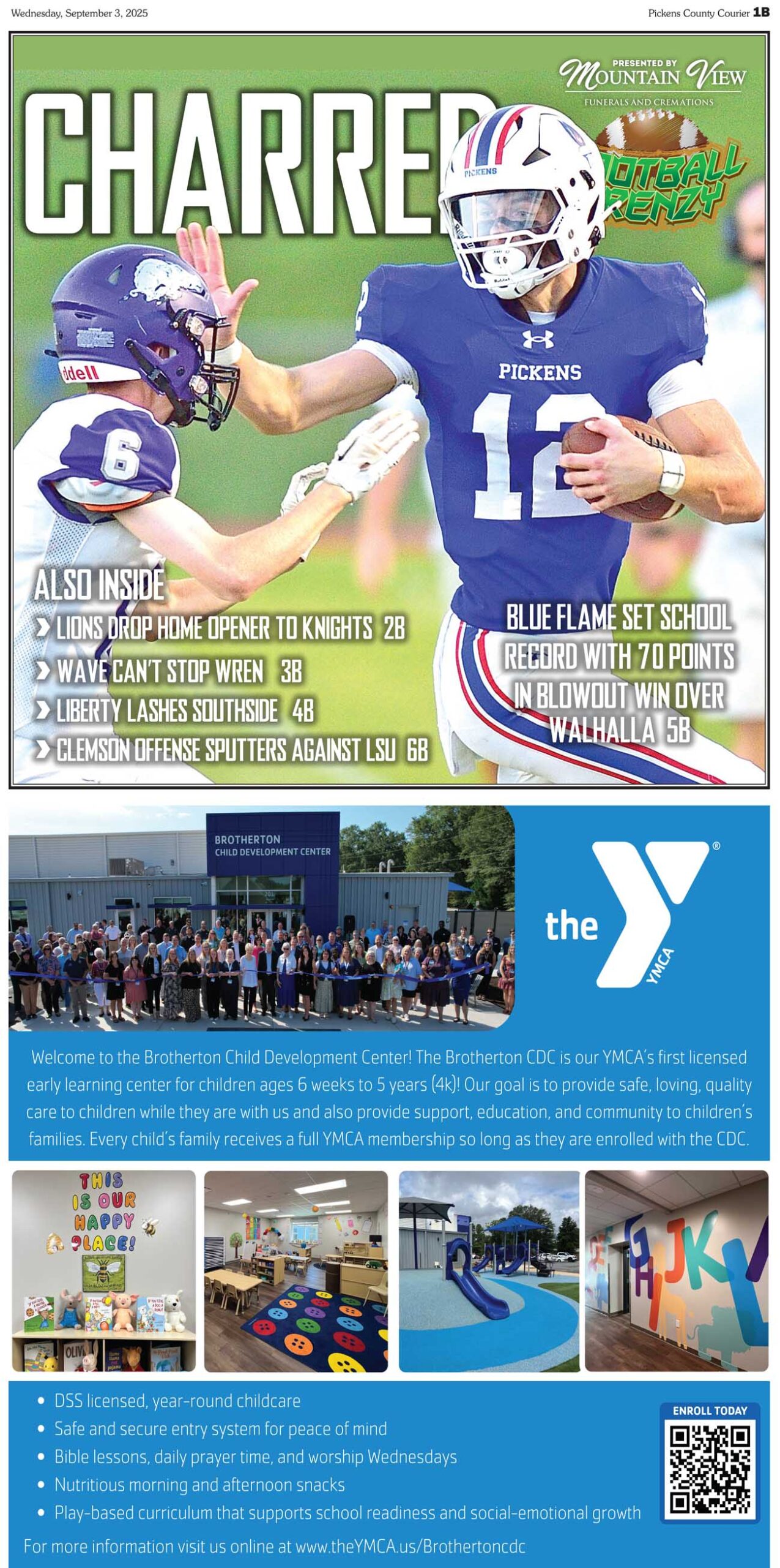 Lions Drop Home Opener to Knights; Wave can’t stop Wren; Liberty lashes Southside; Clemson offense sputters against LSU; all this and more in this week’s FOOTBALL FRENZY, sponsored by Mountain View Funerals and Cremations available only in the Pickens County Courier.