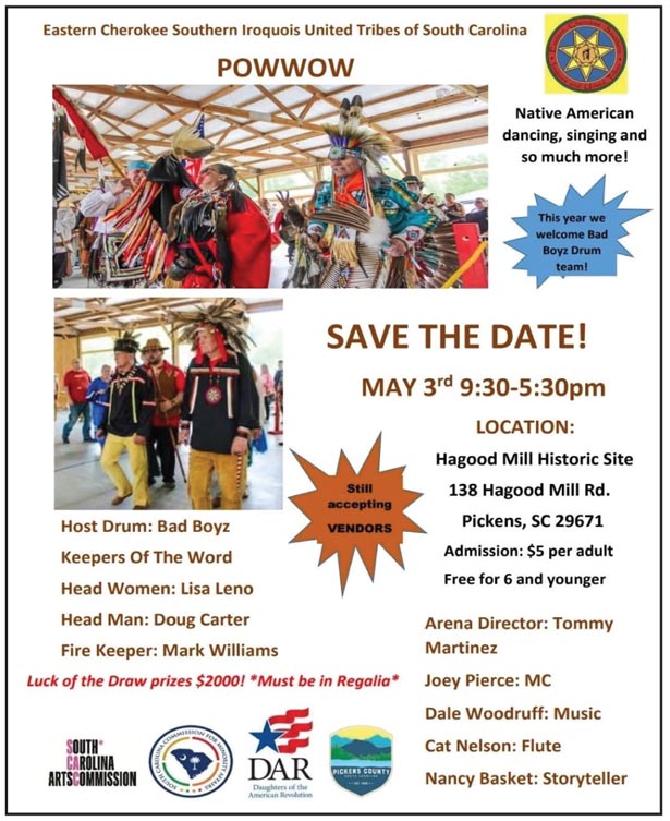 PICKENS — The Eastern Cherokee Southern Iroquois United Tribes of S.C. are set to bring together tribal members and the community to celebrate and learn Native American singing and dancing, storytelling, classes and much more on May 3 at the Hagood Mill Historic Site, located at 138 Hagood Mill Road in Pickens.