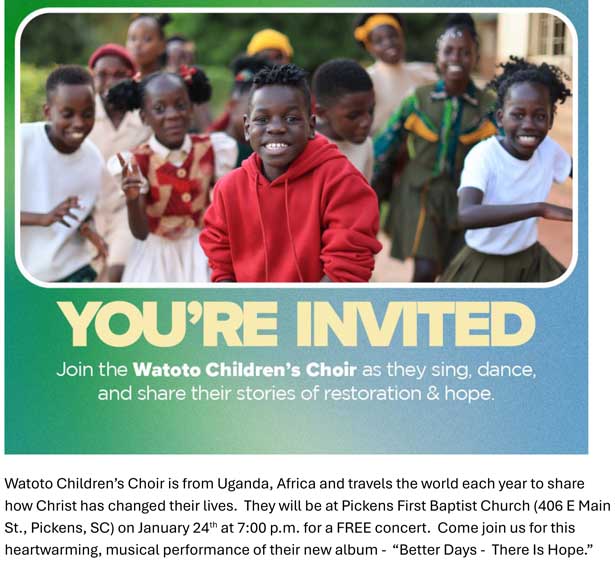 PICKENS – The Watoto Children’s Choir is from Uganda, Africa travels the world each year to share how Christ has changed their lives. On January 24 the choir will be coming to Pickens for all to enjoy. The will be be special guests at Pickens First Baptist Church located at 406 E Main St. in Pickens with singing set to begin at 7 p.m. This special concert will be free to all and everyone in the community to enjoy their wonderful sound and feel this heartwarming, musical performance of their new album – “Better Days – There Is Hope.”