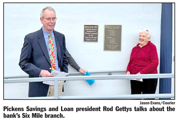 “Back in 2016, the town of Six Mile dedicated this site as a historic landmark,” Six Mile Mayor James Atkinson said outside the bank, which today operates as a branch of Pickens Savings and Loan.