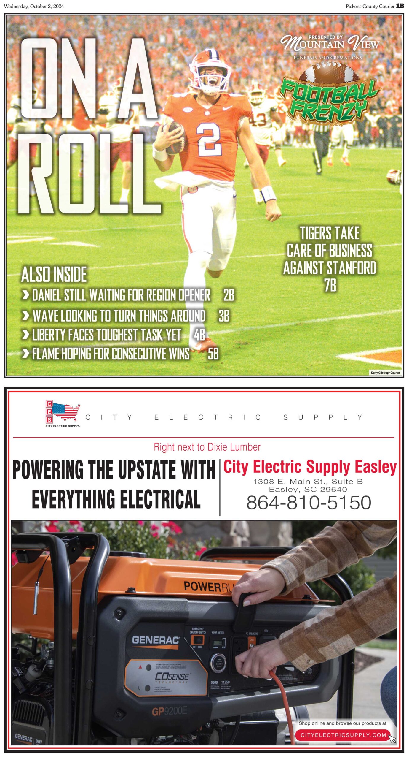 Tigers take care of business against Stanford; Daniel still waiting for region opener; Wave looking to turn things around; Liberty faces toughest task yet and Flame hoping for consecutive wins all this and more in this week’s FOOTBALL FRENZY, sponsored by Mountain View Funerals and Cremations available only in the Pickens County Courier.