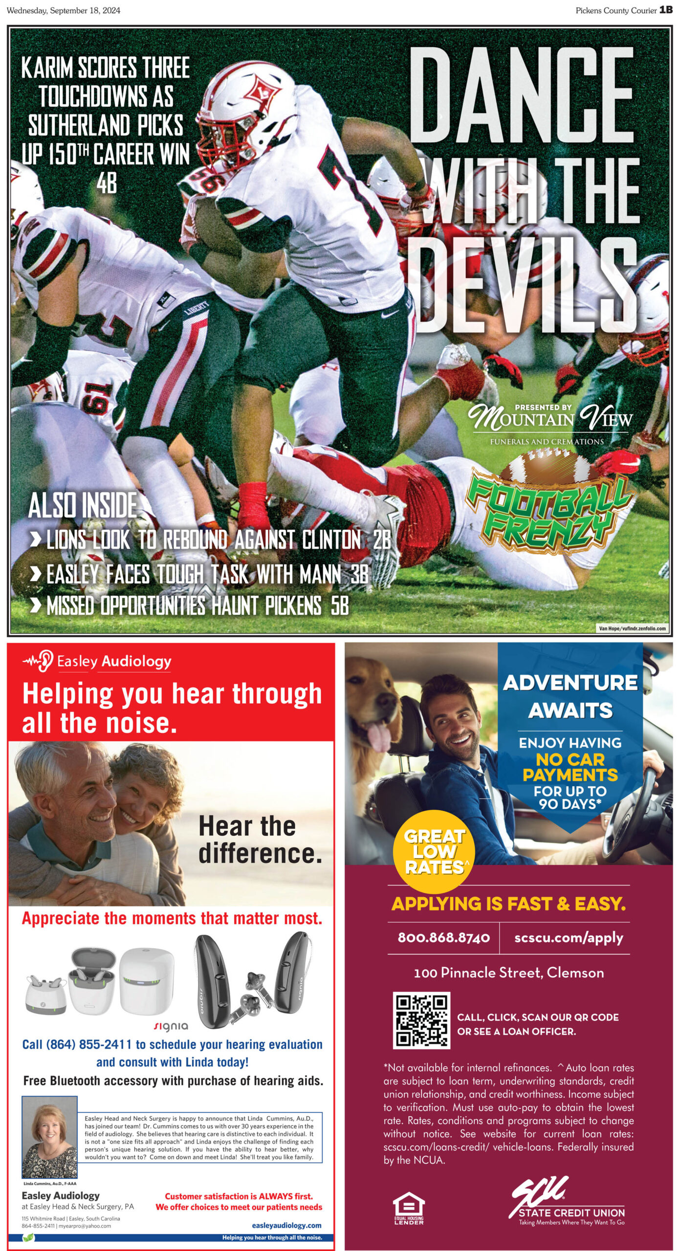 Blue Flame gash Liberty on the ground to move to 2-1; Lions see streak end against J.L. Mann; Easley Picks up first win; Devils fall in close loss to Pickens and Clemson Tigers get back on track. All this and so much more in this week’s Football Frenzy available only in the Pickens County Courier.