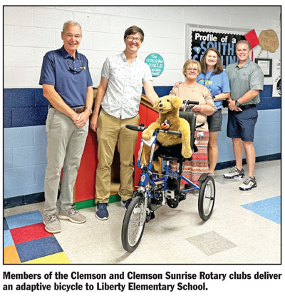 LIBERTY — The Clemson and Clemson Sunrise Rotary clubs recently donated an adaptive bicycle to Liberty