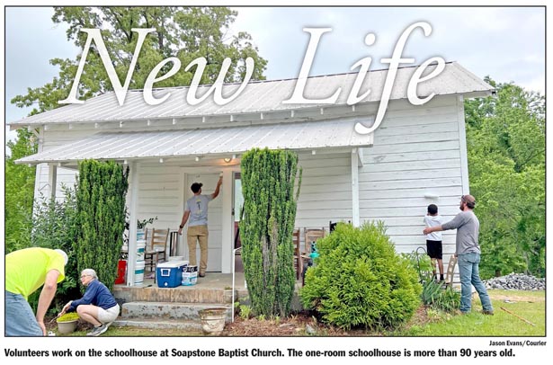 PICKENS — Volunteers were working over the weekend to renovate the one-room schoolhouse on the grounds of historic Soapstone Baptist Church.