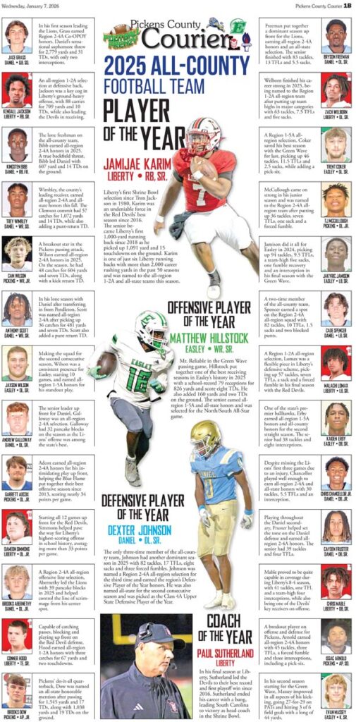 The Courier is ringing in the new year once again with its third annual All-Pickens County football team. With a Shrine Bowl selection, a North-South All-Star and numerous all-state and all-region selections, the 2025 All-County football team is arguably the most decorated team yet. Twenty-nine athletes and one coach were selected to be honored on this year’s squad from Daniel, Easley, Liberty and Pickens high schools. Above: Liberty senior running back Jamijae Karim takes center stage after being selected as the Pickens County Player of the Year. Left: Easley senior receiver Matthew Hillstock was selected as the county Offensive Player of the Year following a record-breaking season. Right: Daniel senior defensive lineman Dexter Johnson became the first three-time All-County selection on his way to being named the Pickens County Defensive Player of the Year. Scroll down to see the entire Football Frenzy third annual All-Pickens County football team.
