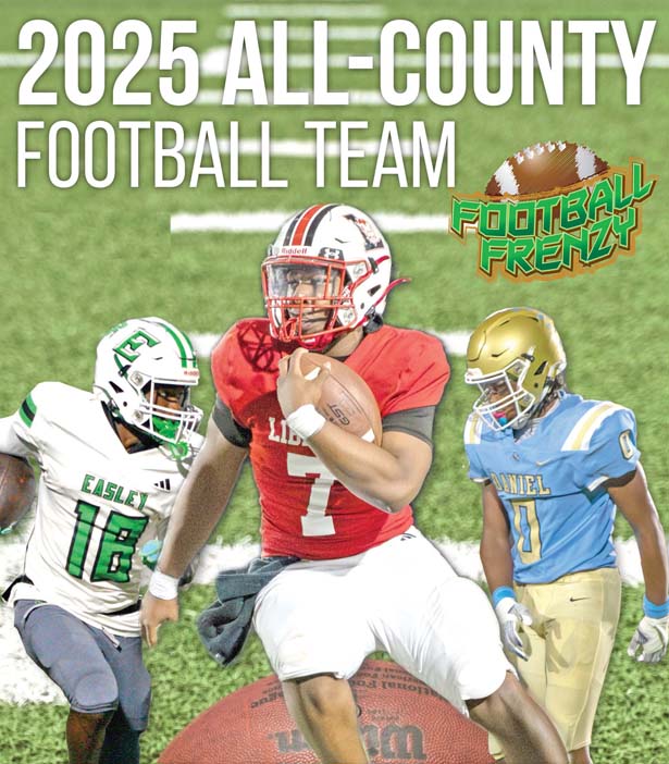 The Courier is ringing in the new year once again with its third annual All-Pickens County football team. With a Shrine Bowl selection, a North-South All-Star and numerous all-state and all-region selections, the 2025 All-County football team is arguably the most decorated team yet. Twenty-nine athletes and one coach were selected to be honored on this year’s squad from Daniel, Easley, Liberty and Pickens high schools. Above: Liberty senior running back Jamijae Karim takes center stage after being selected as the Pickens County Player of the Year. Left: Easley senior receiver Matthew Hillstock was selected as the county Offensive Player of the Year following a record-breaking season. Right: Daniel senior defensive lineman Dexter Johnson became the first three-time All-County selection on his way to being named the Pickens County Defensive Player of the Year. Scroll down to see the entire Football Frenzy third annual All-Pickens County football team.