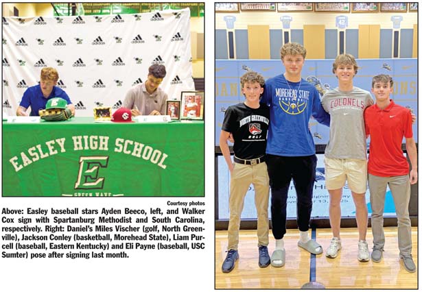 Daniel’s Jackson Conley (basketball, Morehead State), Eli Payne (baseball, USC Sumter), Liam Purcell (baseball, Eastern Kentucky) and Miles Vischer (golf, North Greenville) and Easley’s Ayden Beeco (Spartanburg Methodist, baseball) and Walker Cox (baseball, South Carolina) were honored at their