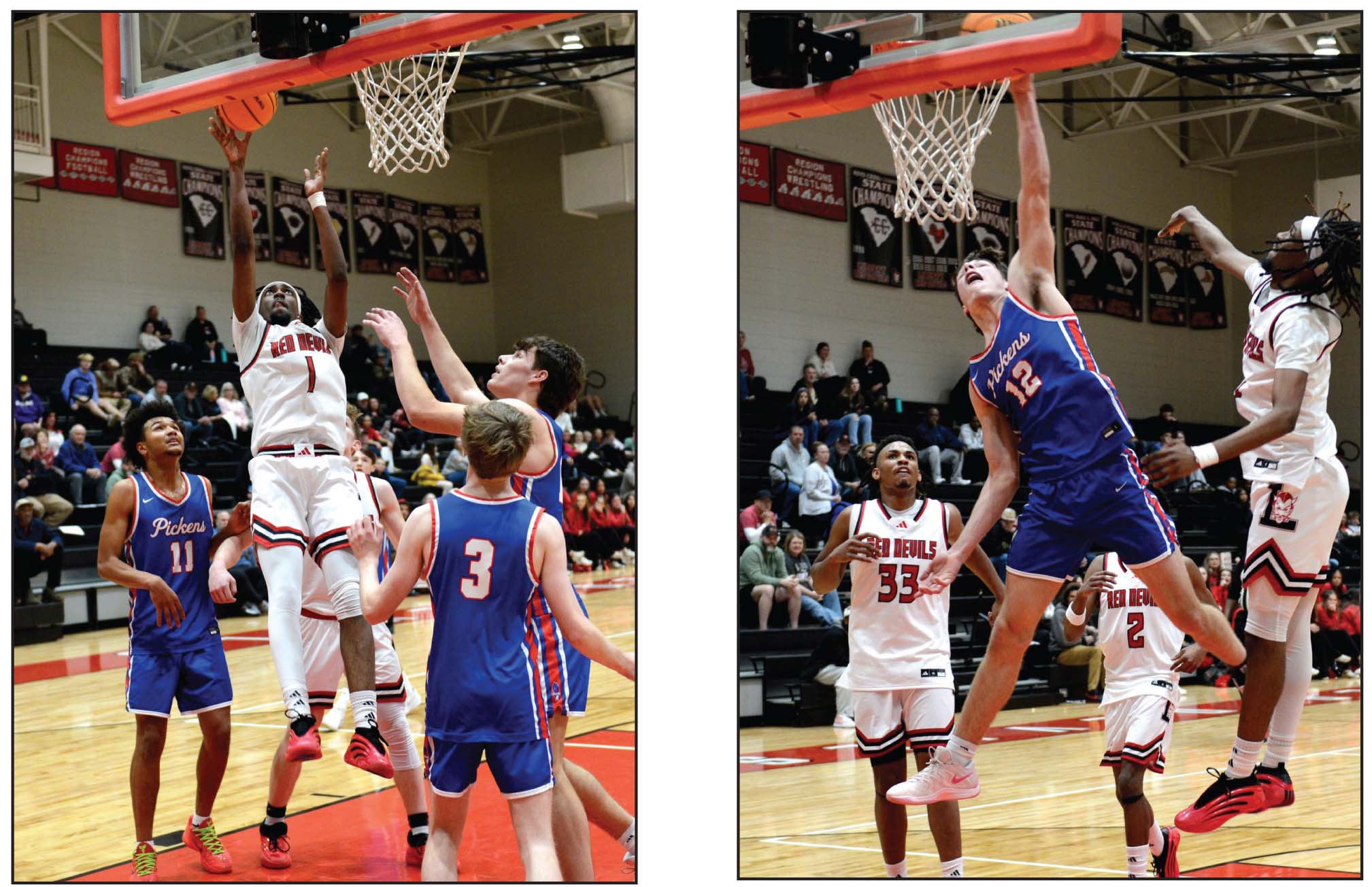 The Liberty and Pickens boys’ basketball teams met on the hardwood for the third time this season on Monday night at Liberty High School. Winners of the previous two matchups, the Red Devils reigned supreme once again on Friday night taking down the Blue Flame 70-50. Above left: Liberty’s Sidney Mongomery fades away on a shot during Monday’s game. Above right: Pickens’ Brooks Dow throws down a one-handed slam in the loss.