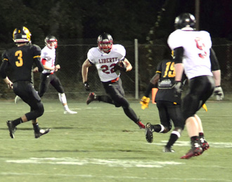 On the ensuing kickoff, Aaron Bates’ super hit on Austin Page forced a fumble, and Liberty’s Kevin Tabron scooped up the loose ball at the Chesnee 41-yard line and raced down the right sideline for a 14-7 Red Devil lead.