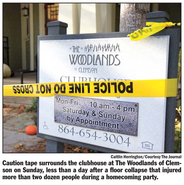 The first floor of the clubhouse at The Woodlands at Clemson collapsed during an annual homecoming weekend party sponsored by the Kappa Alpha Psi fraternity shortly before 12:30 a.m., according to officials.