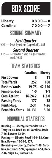 Undeterred by the Trojans’ early momentum, Liberty returned to their three-headed monster of a running game, led by quarterback Peyton Reed and halfbacks J.J. Hernandez and Terry. Hernandez received the majority of the early snaps and paid it off with a six-yard rushing score set to even the game. In a turn of events, a Carolina encroachment penalty on the Red Devils’ extra-point try led to a split-second decision to attempt a two-point conversion instead. Once again, it was Hernandez barreling into the end zone to give Liberty an 8-7 lead early in the second quarter.