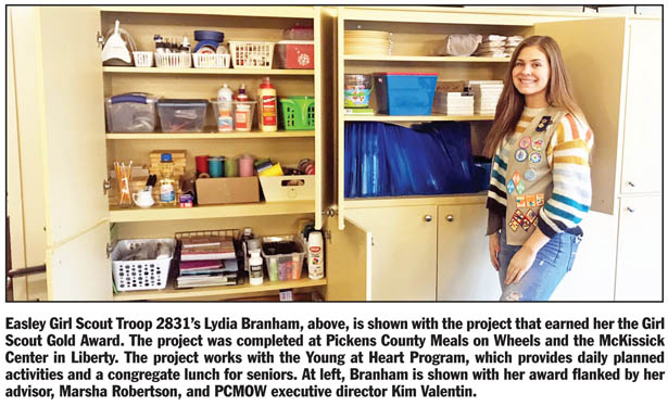 EASLEY — Lydia Branham of Girl Scout Troop 2831 in Easley recently completed her special project at Pickens County Meals on Wheels and the McKissick Center.