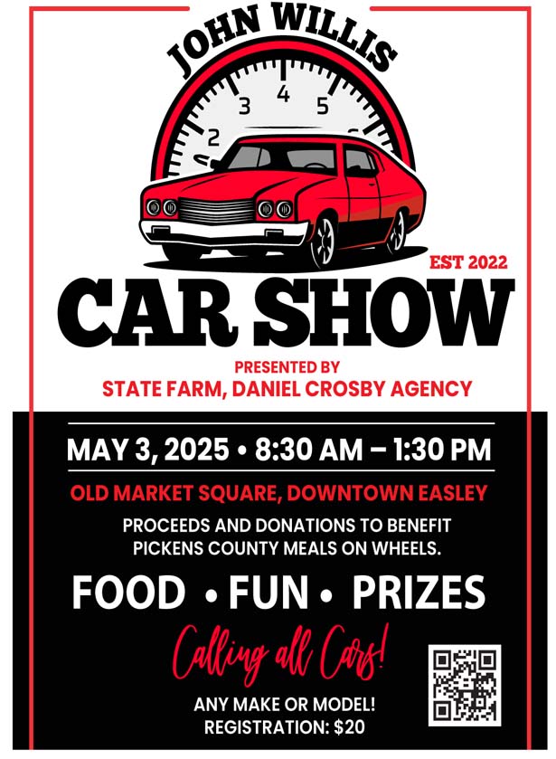 the John Willis Car Show, presented by State Farm’s Daniel Crosby Agency on Saturday, May 3, at Old Market Square in downtown Easley.