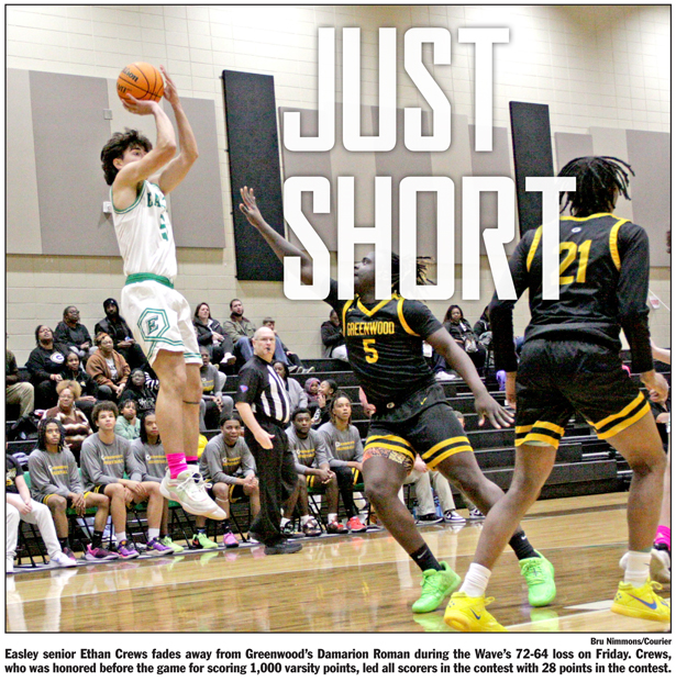 However, foul trouble for Easley sophomore forward R.J. Stack slowed the Wave and allowed Greenwood’s CJ Terrell to get going, leading the Eagles to roll on a 31-9 run into the second half. Despite a ferocious comeback attempt led by senior Ethan Crews, the run was too much for Easley to
