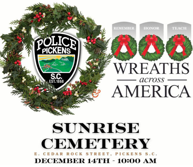 PICKENS — The Pickens Police Department invites the public to join officials for the National Wreaths Across America wreath-laying ceremony this Saturday, Dec. 14, at 10 a.m. at Sunrise Cemetery, located on East Cedar Rock Street in Pickens.