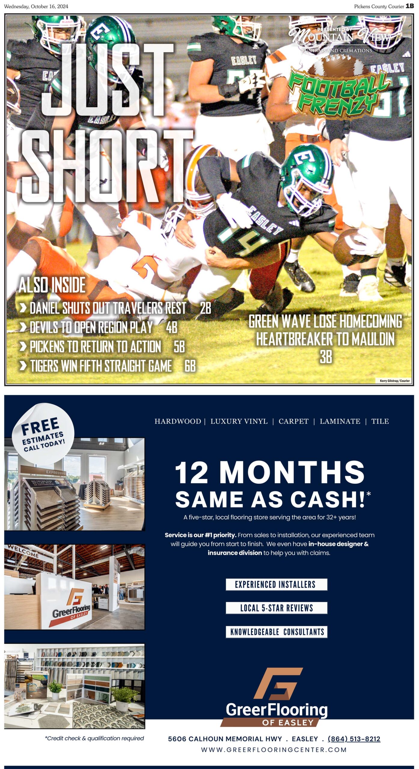 Green Wave lose homecoming heartbreaker to Mauldin; Daniel shuts out Travelers Rest; Devils to open region play; Pickens to return to action; Tigers win fifth straight game all this in this week’s FOOTBALL FRENZY, sponsored by Mountain View Funerals and Cremations available only in the Pickens County Courier.