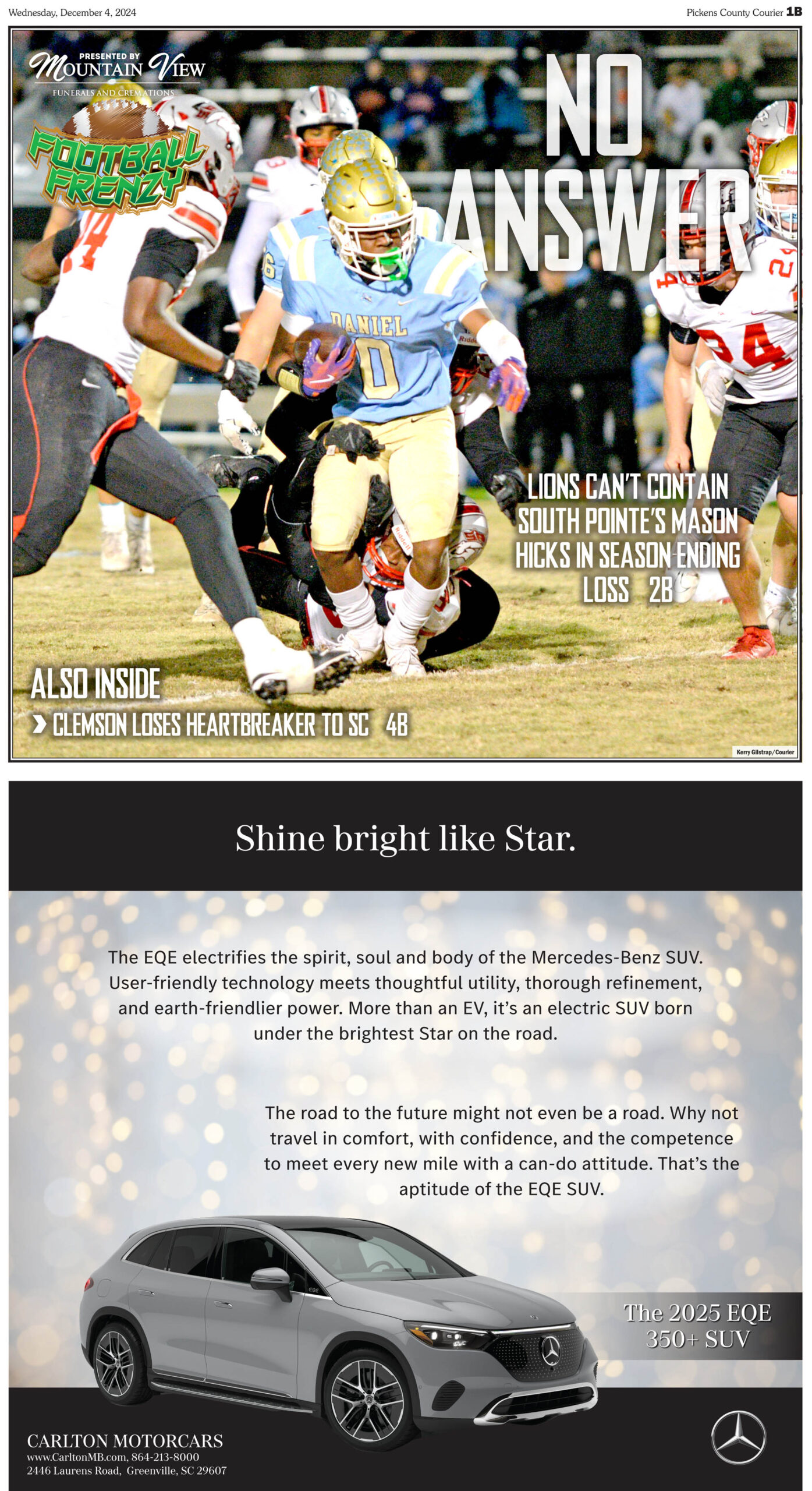 LIONS CAN’T CONTAIN SOUTH POINTE’S MASON HICKS IN SEASON-ENDING LOSS; ClEMSON LOSES HEARTBREAKER TO SOUTH CAROLINA all this and more in this week’s FOOTBALL FRENZY, sponsored by Mountain View Funerals and Cremations available only in the Pickens County Courier.