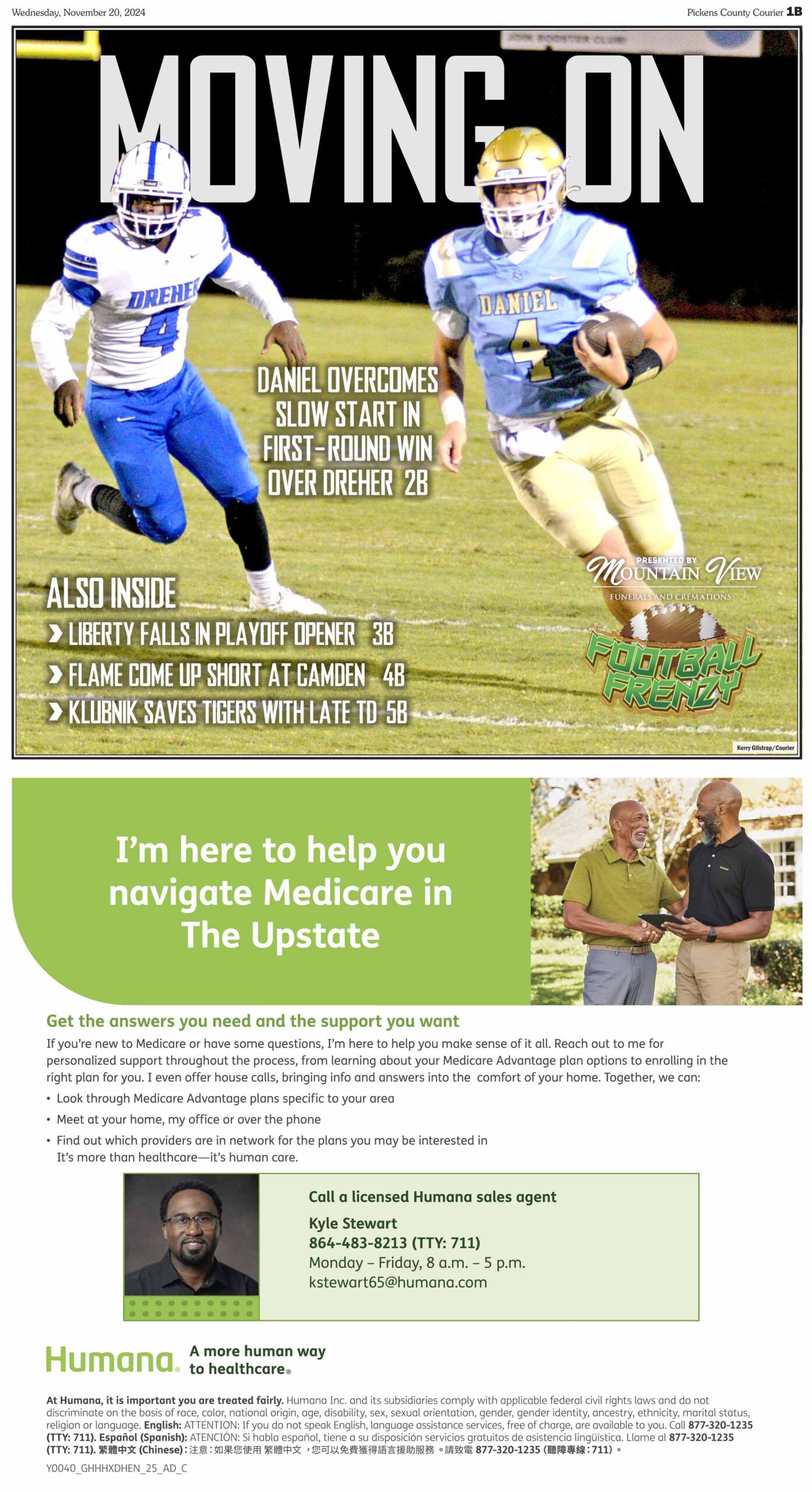 DANIEL OVERCOMES SLOW START IN FIRST-ROUND WIN OVER DREHER; LIBERTY FALLS IN PLAYOFF OPENER; FLAME COME UP SHORT AT CAMDEN; KLUBNIK SAVES TIGERS WITH LATE TD; all this and more in this week’s FOOTBALL FRENZY, sponsored by Mountain View Funerals and Cremations available only in the Pickens County Courier.