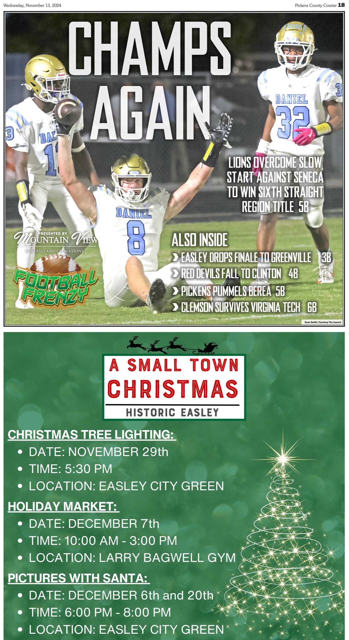 LIONS OVERCOME SLOW START AGAINST SENECA TO WIN SIXTH STRAIGHT REGION TITLE; EASLEY DROPS FINALE TO GREENVILLE; RED DEVILS FALL TO CLINTON; PICKENS PUMMELS BEREA; CLEMSON SURVIVES VIRGINIA TECH; all this and more in this week’s FOOTBALL FRENZY, sponsored by Mountain View Funerals and Cremations available only in the Pickens County Courier.