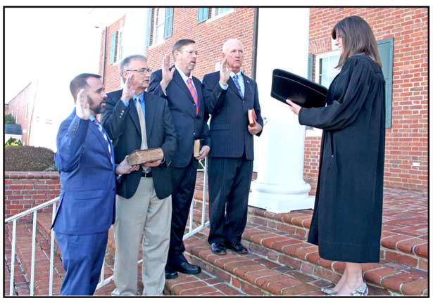Members of the Pickens County’s Legislative Delegation take the oath of office on the Pickens County Courthouse steps in Pickens on Tuesday afternoon. From left are Neal Collins (S.C. House District 5), Davey Hiott (S.C. House District 4), Phillip Bowers (S.C. House District 3) and Rex Rice (S.C. Senate District 2) being sworn in by Judge Karen Roper.