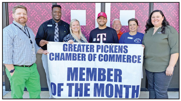 The Greater Pickens Chamber Member of the Month for October is T-Mobile Pickens. The cellular business is located at 2829 Gentry Memorial Highway and offers the latest in 5G technology. The store is filled with mobile experts dedicated to superior sales assistance and service. “To elevate your communication with the best devices and accessories, call us today at (864) 507-5541,” the business said. Pictured are chamber ambassadors Hugh Latimer, Meechi Green and Brittany Chapman, T-Mobile Pickens store manager Francisco Perez, and chamber board members Bryan Owens, Melisa Sedler and Jessica Callahan.
