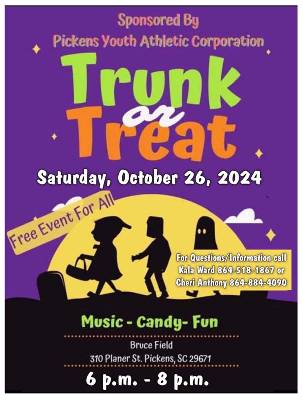 The Pickens Youth Athletic Corporation will be hosting its annual Trunk or Treat from 6-8 p.m. Saturday, Oct. 26, at Bruce Field, located at 310 Planer St. in Pickens.