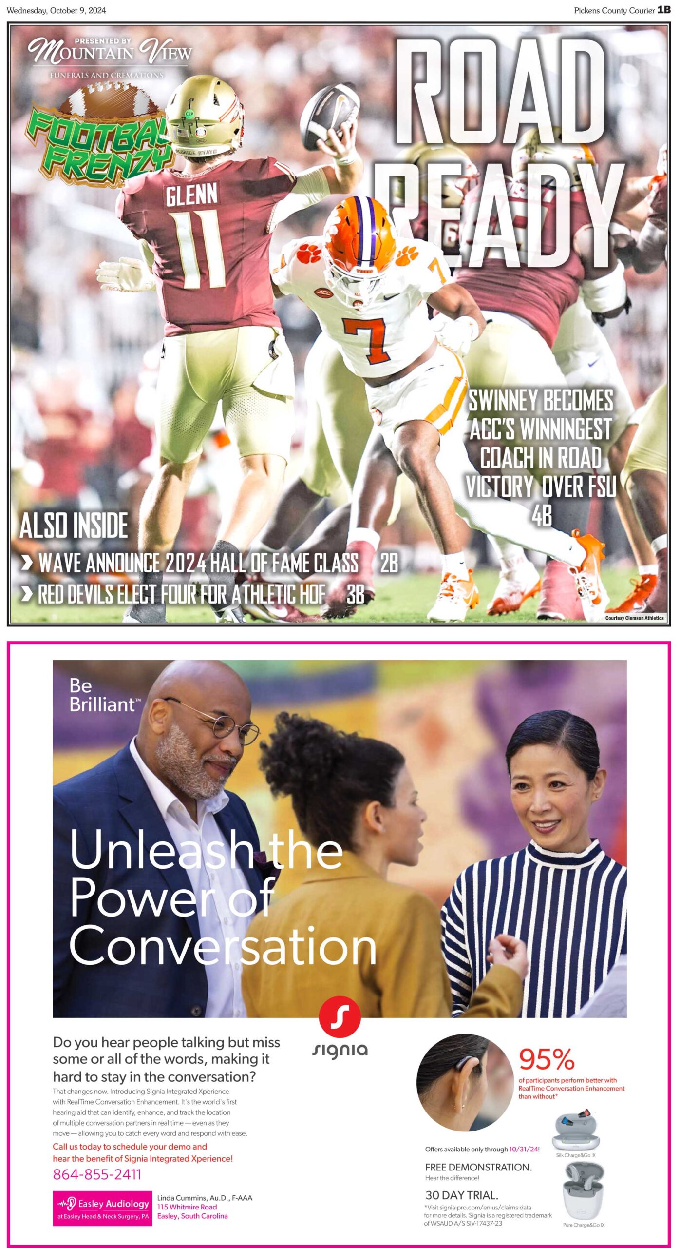 Swinney becomes ACC’s winningest coach in road victory over FSU; Wave announce 2024 Hall of Fame class and Red Devils elect four for Athletic HOF all this in this week’s FOOTBALL FRENZY, sponsored by Mountain View Funerals and Cremations available only in the Pickens County Courier.