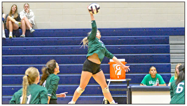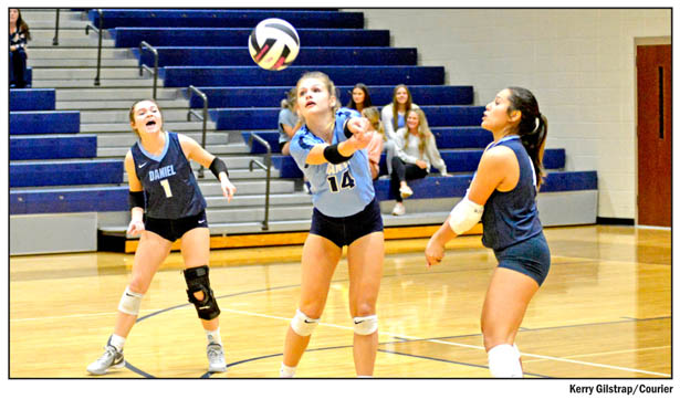 The Daniel and Easley High School volleyball teams competed in a tri-match with Wren at Daniel High School last Wednesday. Daniel went 1-1 at the match defeating their county foe and falling to the Hurricanes, while the Green Wave lost both matchups. Above: Daniel’s Ava Ross reaches out to make a dig. Below: McKenzie Carr takes a swing at the ball.