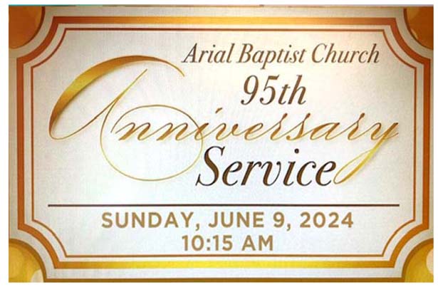 Arial Baptist Church is Celebrating our 95th Anniversary on June 9 at 10:15 a.m. Past members, guests and visitors from the community are invited to attend this celebration of God’s faithfulness. The church is located at 618 Rice Road in Easley For more information contact the church office at 864-859-7234.