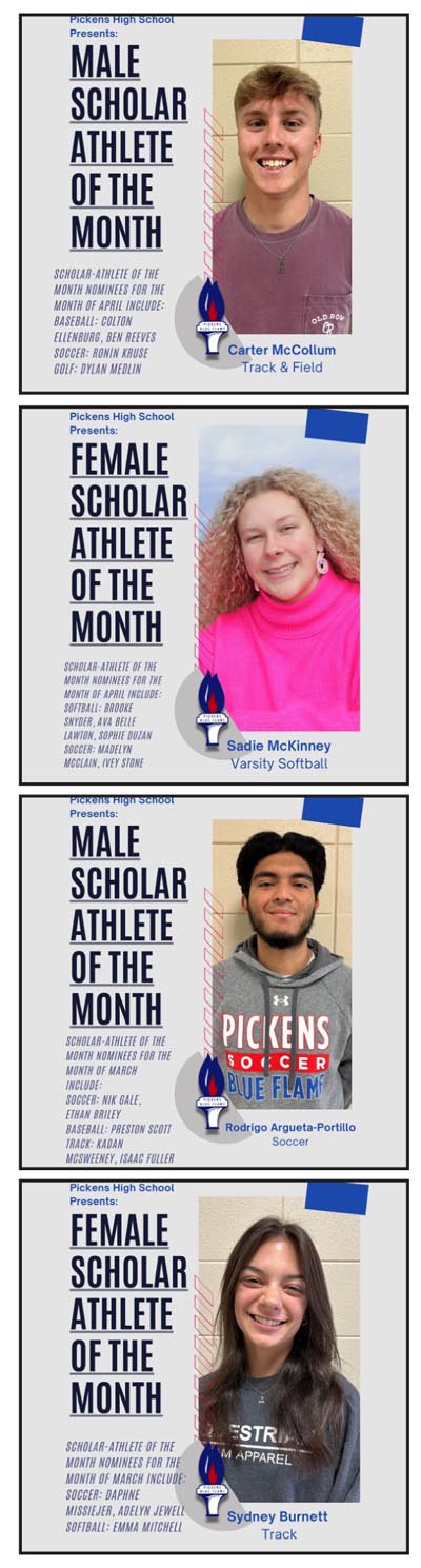 PICKENS — Every month, Pickens High School celebrates student athletes who work hard in the classroom by naming Scholar-Athletes of