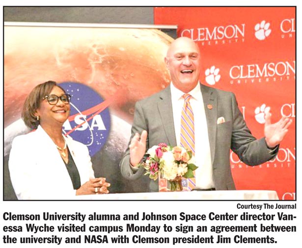 Clemson alumna and Johnson Space Center director Vanessa Wyche visited Clemson Monday to sign the agreement with university president Jim Clements. Johnson Space Center in Houston, Texas, is home to America’s astronaut corps, NASA’s Mission Control Center, International Space Station operations and a