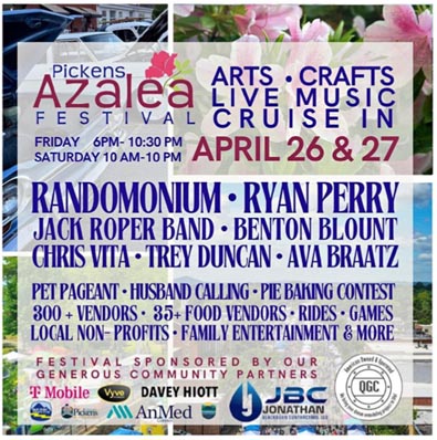 PICKENS — The Pickens Azalea Festival, one of the largest arts and crafts festivals in the Southeast, returns to downtown Pickens, SC, to commemorate 40 years of tradition. After a record-breaking attendance of over 55,000 in 2023, this year’s festival promises an exhilarating