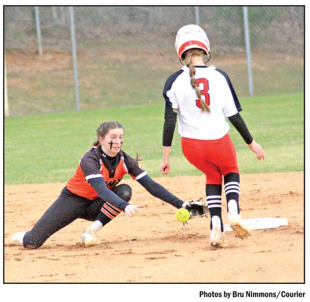 The Liberty High School baseball and softball teams took on an unfamiliar foe when the Rosman High School Tigers of Rosman, N.C., came to town on Monday night. The Red Devil softball team built an early lead in their matchup, before a seven-run second inning put the Tigers ahead for good in a 10-6 loss for Liberty. Above: Liberty pitcher Aubrey Moore tries to beat the tag from Rosman’s Kiki Sexton. Meanwhile, the Liberty baseball bounced back in a big way after dropping consecutive region games to Landrum with a 17-2, run-rule shortened, three inning victory. Below: Liberty pitcher Blade Epps gave up just one hit, a solo home run, while striking out five batters in the Red Devils’ three-inning win.