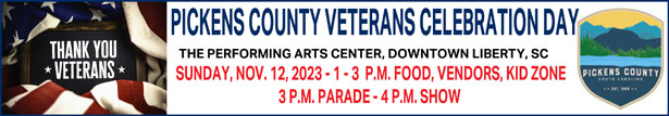 On Nov. 11, the Pickens County Veterans Appreciation Dinner will be held at Golden Creek Baptist Church in Liberty from 4-6 p.m. According to the county Veterans Affairs office, the dinner will be an evening of camaraderie and reflection as locals come together to express deep appreciation for the service and sacrifice of local veterans. To RSVP, call (864) 898-5926 or (864) 898-5928. The Pickens County Veterans Day celebration will be held the next day on Nov. 12 at the Pickens County Performing Arts Center in Liberty. The event will start at 1 p.m., with vendors, food and a kid zone. There will be a parade at 3 p.m. and a show with live music and speakers beginning at 4:30 p.m. The event is open to every who wishes to remember and honor those who have served our country with dedication and bravery. For more info visit @pickenscountyveteransaffairs for details.