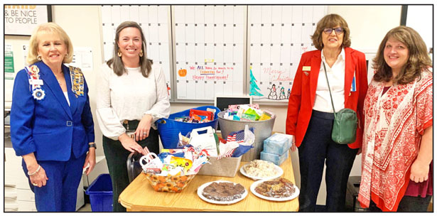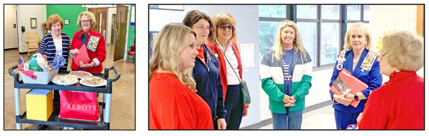 As part of the Daughters of the American Revolution (DAR) National Day of Service, Fort Prince George Easley Chapter members took student school supplies and staff thank you baskets to Lakes and Bridges Charter School, Liberty Primary School and Pickens Elementary School. Each school received baked goodies and health bars, along with educational supplies. “Our chapter loves to surprise the schools,” said community classroom committee chair Darlene Levy, who organized the event. Pictured above, Liberty Primary assistant principal Joy Ellison, Carolyn Nations, Darlene Levy and school counselor Tina Kelly are shown with the goodies the school received. At lower left, DAR members Joyce Hansel and Harriet Nash at Lakes and Bridges Charter School, and at lower right, Pickens Elementary assistant principal Lacey Rogers, Teresa Efant, Darlene Levy, Lana Beckley, Carolyn Nations and Harriet Nash speak during the DAR visit.