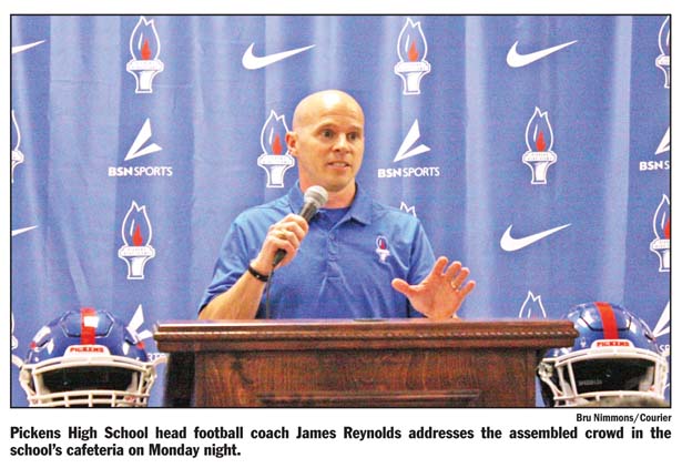PICKENS — In front of a gathered crowd in the Pickens High School cafeteria on Monday night, new Pickens head football coach James Reynolds laid out his vision to lead the Blue Flame back to prominence.