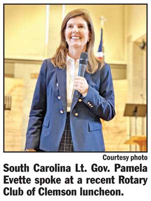 CLEMSON — South Carolina Lt. Gov. Pamela S. Evette spoke to a group of almost 100 community leaders at the Rotary Club of Clemson luncheon last week at
