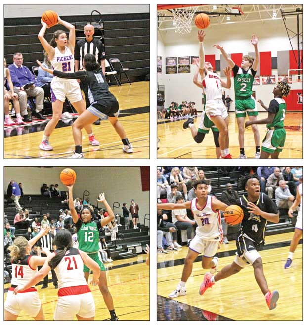Pickens County high schools kicked off basketball season last week with the second-annual Pickens County Basketball Jamboree at Liberty High School. All four county schools were represented during the games, with the Easley squads taking on Liberty and Daniel facing off with Pickens. The games were contested in single 20-minute halves with a running clock. Easley took both of the matchups with Liberty, winning 24-2 in the girls’ game and 24-8 in the boys’ matchup. In the other games, the Pickens girls downed Daniel16-4, while the Daniel boys cruised to a 31-13 win over the Blue Flame. Pictured, clockwise from top left, are Pickens’ Jayden Harden looking for an outlet while being guarded by Daniel’s Destiny Hoover, Liberty’s Alex Peraza laying in a ball against the outstretched arm of Easley’s Carson Freeze, Daniel’s Tristyn Carrington driving by Pickens’ Tucker Perry on his way to the hoop and Easley’s Olivia Gramblin shooting over the top of the Red Devil defense. The season will get into full swing for all four county teams over the next few weeks.