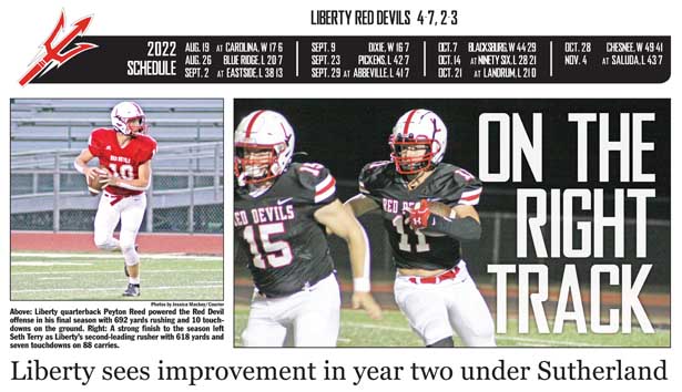 LIBERTY — After winning just two games in head coach Paul Sutherland’s first season at the helm, the Liberty Red Devils took some big steps forward in their 2022 campaign, doubling their win total and making the playoffs for the first time under Sutherland.