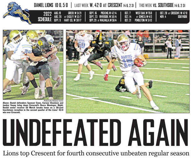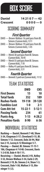 IVA — With a chance to finish the regular season unbeaten for a fourth straight year, the Daniel High School football team traveled to Crescent on Friday night and cruised from start to finish in a 42-0 win.