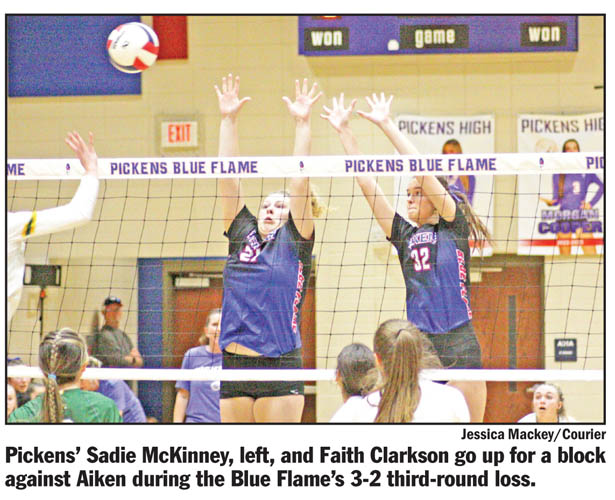 PICKENS — Down 17-16 in the consequential fifth set against Aiken, the Pickens Blue Flame were in a familiar spot, having already survived match point against the Green Hornets four times late in the set.
